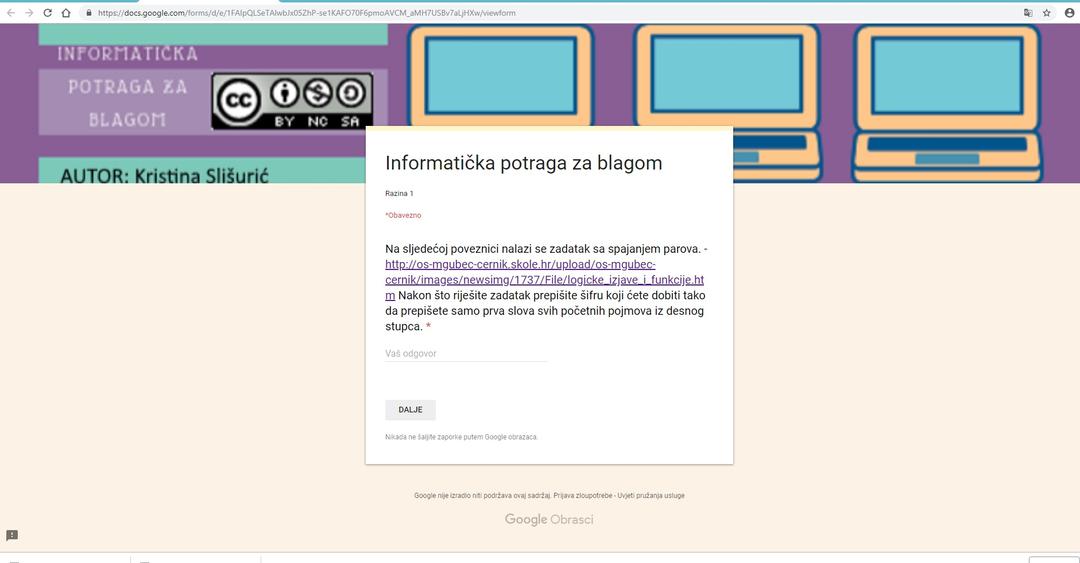 Informatička potraga za blagom je digitalni obrazovni sadržaj napravljen u alatu Google Forms s ciljem ponavljanja i utvrđivanja naučenih sadržaja iz Informatike u osmom razredu za dolje navedene ishode kao i za razvijanje suradnje komunikacijske kompetencije i dobrih odnosa među učenicima koji rade u timu na zajedničkom zadatku.
