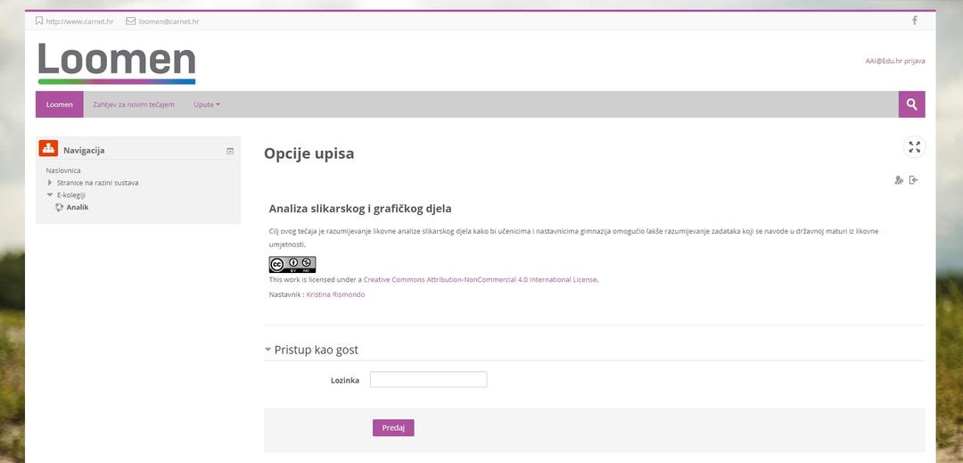 Tečaj Analiza slikarskog i grafičkog djela objavljen je na Loomenu. Namijenjen je prvenstveno učenicima no mogu se njime koristiti i nastavnici gimnazija. Tečaj obuhvaća ishode objavljene u katalogu NCVVO za likovnu umjetnost i to (određivanje i razlikovanje) formata i kadra likovnoga primjera (određivanje i razlikovanje) elemenata grafičke analize likovnoga primjera (određivanje i razlikovanje) kompozicije i njezinih karakteristika (određivanje i razlikovanje) kompozicijskih pravila ritma i ravnoteže likovnoga primjera. Zamišljen je kao asinkrona forma kako bi se polaznici mogli neprekidno uključivati i isključivati iz tečaja koji omogućuje osnovne informacije o likovnoj analizi a nadam se da je djelomično i demistificira. Inovativnost se može prepoznati u alatu koji se koristi te vizualnim prezentacijama koje obuhvaćaju slike ilustracije izvedene vektorskom grafikom potom video-zapise realizirane uglavnom u aplikaciji Moovly (prije nego što je postala komercijalna). Alati koje pruža Loomen su iskorišteni kroz resurse (stranica natpis poveznica) i aktivnosti (lekcija rječnik). Od vanjskih alata koristi se Youtube SlideShare i Issuu za umetanje prezentacije i e-knjige u lekciju. Svi materijali su moji tako da su neki več i bili objavljivani (Youtube Blogger Slideshare) pa je Loomen omogućio sintezu. Na izvjestan način ovdje se radi o obrnutoj učionici jer učenici mogu pristupiti materijalima izvan nastave. Format bi mogao biti zanimljiv obzirom na to da tečaj nije linearno zamišljen oblikovan je u grid verziji i sve su teme i aktivnosti dostupne. Tri su teme (O Analizi likovnog djela Formalna i grafička analiza te Interpretacija. Rad je objavljen pod otvorenom licencom.
