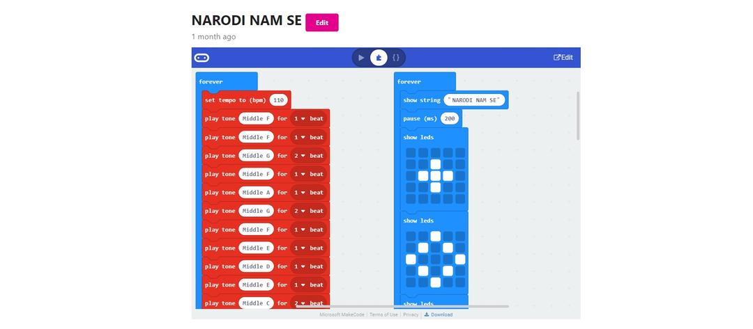 b) Inovativno korištenje – izmjena gotovog programa. Svaki se od 3 programa sastoji od 2 skupine blokova: jedna omogućava melodijsku interpretaciju pjesmice dok druga skupina omogućava da se na ekranu micro:bita ispiše naslov pjesme uz prigodnu animaciju. Učenici mogu izmijeniti vrijednost tempa promijeniti oblik pjesme umjesto naslova pjesme dodati blagdansku čestitku ili izmijeniti izgled animacije prema svom ukusu. Nakon promjene brzine tempa mogu prodiskutirati u kakvom je tempu primjerenije izvoditi ovu pjesmu te kako promjena tempa utječe na različite uloge glazbe (svečana glazba glazba za ples i sl.