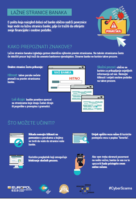 Infografika pokazuje kako prepoznati znakove koji pokazuju da je stranica banke lažna te što možete učiniti ako posumnjate da je stranica banke lažna.