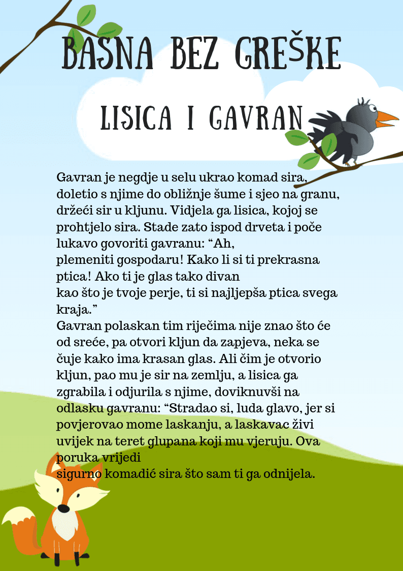 Scenarij poučavanja basne Lisica i gavran prikazan je kroz interaktivne materijale. Usmjeren je na interpretativno čitanje te rješavanje problemskog zadatka Basna s greškom.