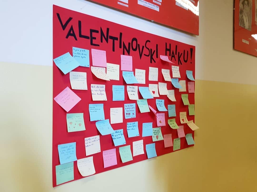Učenici Srednje škole Ban Josip Jelačić u Zaprešiću obilježili su Valentinovo na malo drugačiji način a rezultate rada predstavili su na izložbi u holu škole u online izložbi te pisanjem haiku pjesama na hrvatskom engleskom njemačkom i talijanskom jeziku. Projekt je proveden u uspješnoj suradnji redovne nastave iz hrvatskog jezika fakultativnih nastava iz engleskog njemačkog i talijanskog jezika te Sekcije za poticanje višejezičnosti.