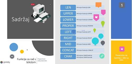 Stranica sa zadacima izrađena u Genially alatu sadrži zadatke iz funkcija za obradu teksta u programu Excel.