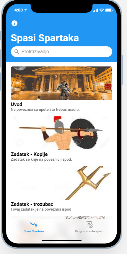 Escape room napravljen u aplikaciji glide. Učenici moraju rješiti 5 zadataka da bi dobili šifru i spasili Spartaka koji je nesretnim slučajem završio u moderno doba.