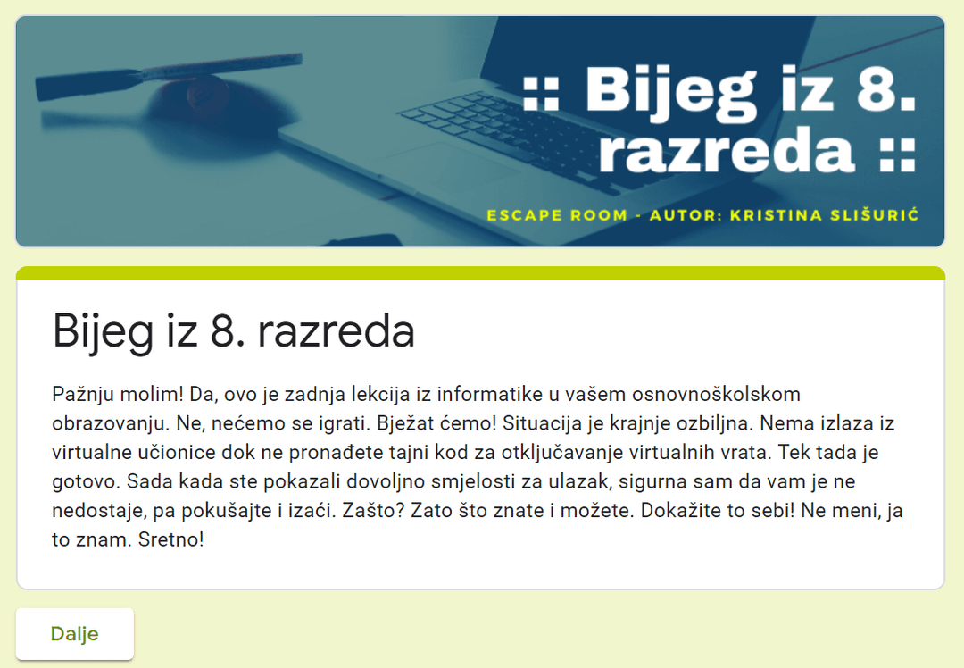 Digitalni obrazovni sadržaj u obliku Escape rooma, napravljen u alatu Google Forms, a namijenjen učenicima osmih razreda na kraju školske godine za usustavljivanje gradiva i utvrđivanje usvojenosti ishoda učenja.