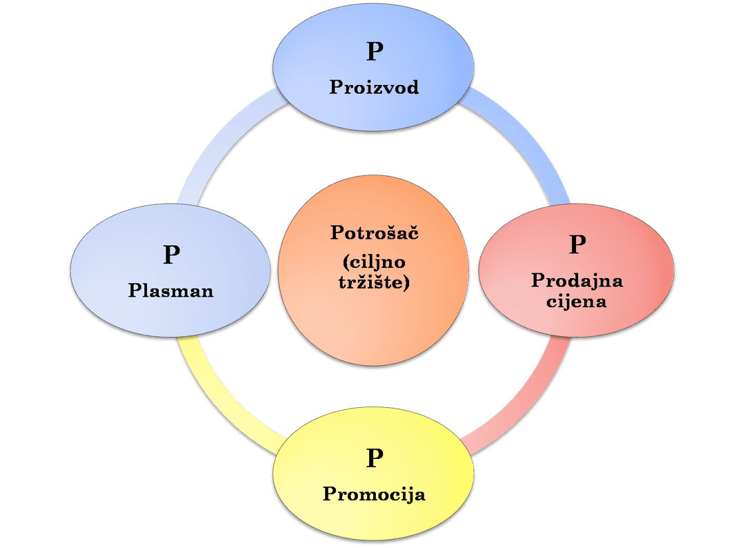 proizvod, promocija, plasman, prodajna cijena, marketinški splet, ciljno tržište