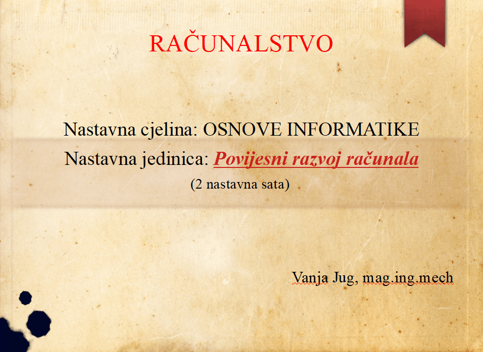 Prezentacija je namjenjena nastavnicima i učenicima te opisuje sva četiri razdoblja povijesnog razvoja računala (ručnu obradu, mehaničku obradu, elektromehaničku obradu te električnu obradu podataka).