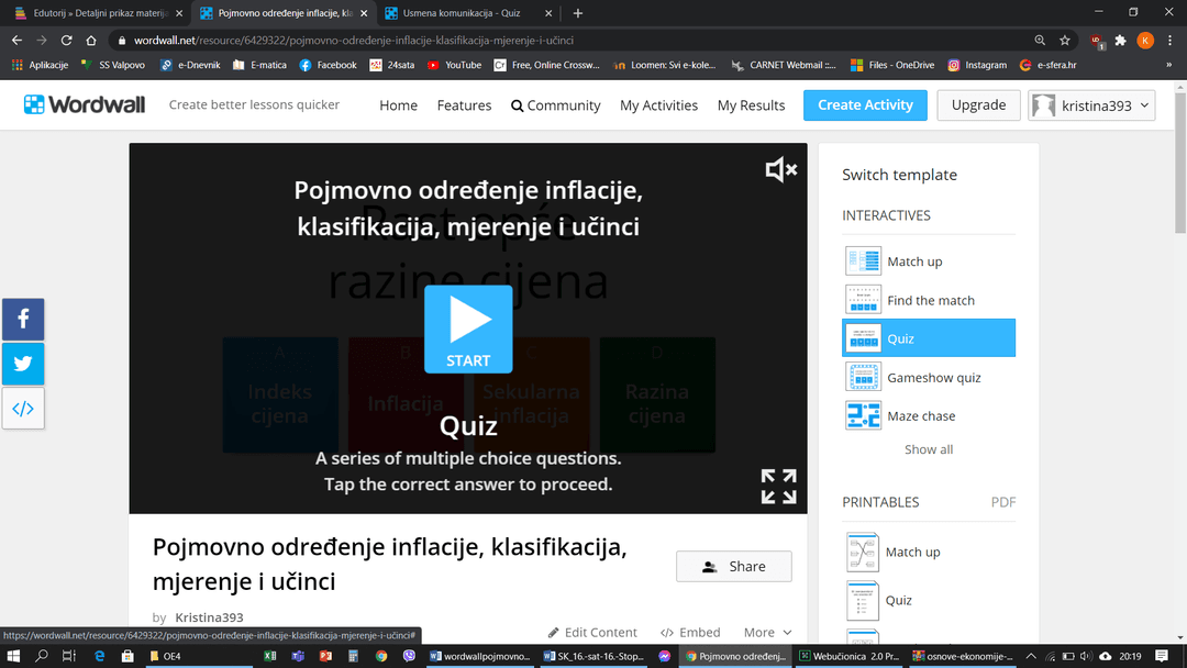 U wordwallu pripremljen materijal za ponavljanje gradiva vezano uz nastavnu jedinicu o pojmovnom određenju inflacije klasifikacija mjerenju i učincima inflacije