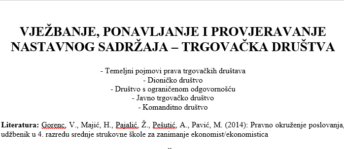 Literatura: Gorenc V. Majić H. Pajalić Ž. Pešutić A. Pavić M. (2014): Pravno okruženje poslovanja udžbenik u 4. razredu srednje strukovne škole za zanimanje ekonomist/ekonomistica