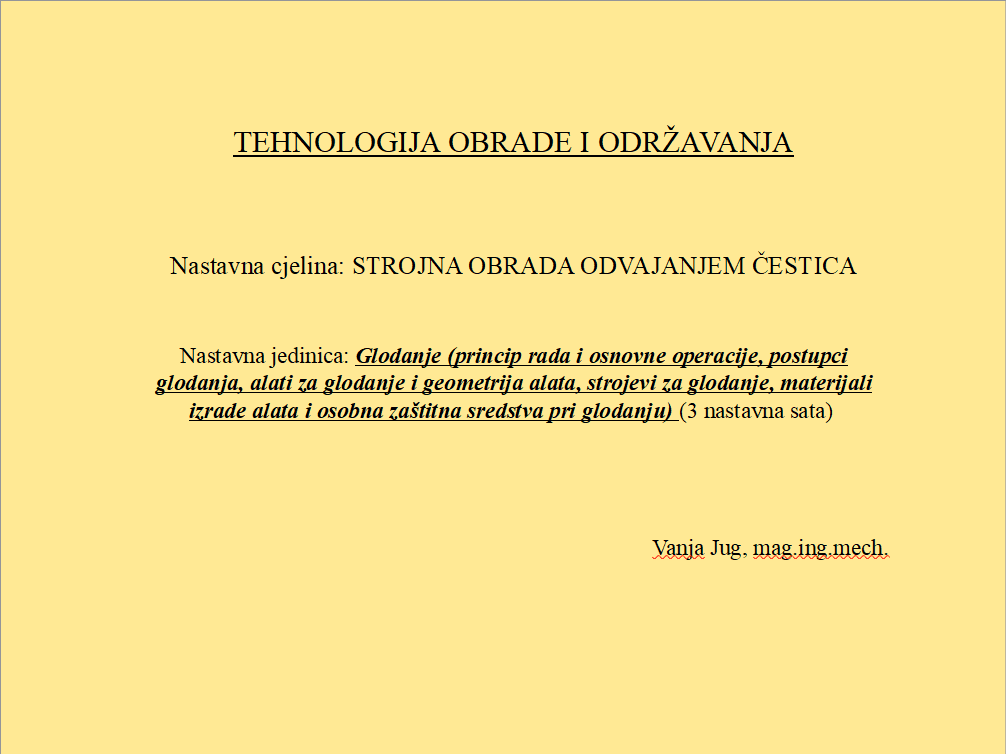 Materijal je napravljena za nastavnu iz predmeta Tehnologija obrade i održavanja, iz nastavne jedinice Glodanje (princip rada i osnovne operacije, postupci glodanja, alati za glodanje i geometrija alata, strojevi za glodanje, materijali izrade alata i osobna zaštitna sredstva pri glodanju) te je namijenjena i nastavnicima i učenicima.