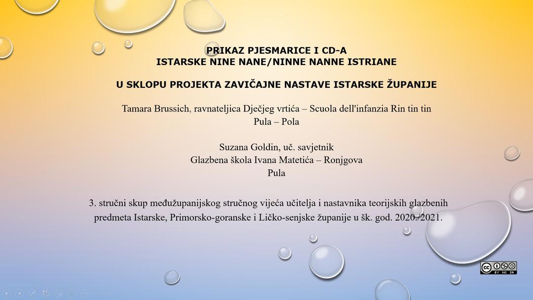 U prioženom materijalu prikazani su pjesmarica i cd Istarske Nine Nane - Ninne Nanne Istriane u sklopu projekta zavičajne nastave Istarske županije.