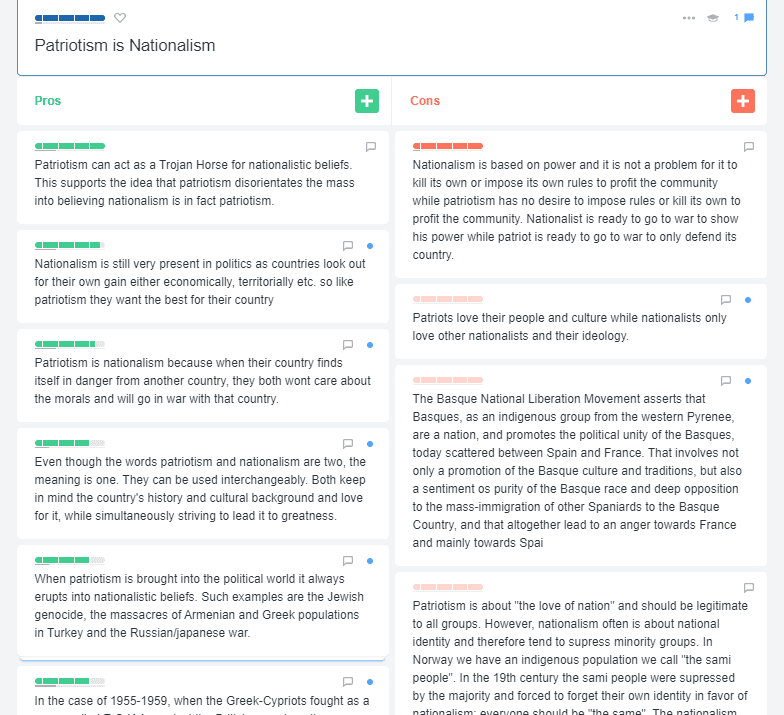 Unutar svojih grupa koje su surađivali u „breakout“ sobi unutar glavnog sastanka učenici su iznosili svoje argumente koje su istražili i pripremili unutar svojih nacionalnih timova u pripremnoj fazi. Zatim bi ostali učenici nadopunjavali argumentaciju sa sličnim primjerima iz svoje zemlje ili povijesti. Iznesene argumente unosili smo u digitalnu aplikaciju kialo edu koja je osmišljena upravo sa svrhom da pomogne u podučavanju kritičkom razmišljanju olakšavanju racionalne rasprave i objašnjavanje kontroverznih pitanja. Aktivnos je traja sat vremena i u tom periodu formulirani su mnogi argumenti i za jednu i za drugu stranu potkrepljeni razvnovrsnim dokazima i primjerima iz današnjeg svijeta ili suvremene povijesti. U svim dijelovima projektne aktivnosti učenici su aktivno i puno radili te su na kraju izrazili u evaluaciji svoje zadovoljstvo uzbuđenost zbog sudjelovanja u ovakvom jednom međunarodnom događaju a najvažnije da su puno naučili te da su im sada jasni pojmovi patriotizma i nacionalizma.