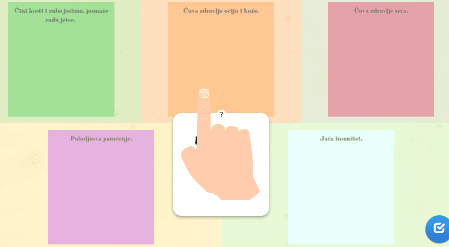 Biraj šareno - okusi dugu! interaktivna je igrica grupacije izrađena u aplikaciji LearningApps prema motivima iz brošure Proslavimo Tjedan školskog doručka zajedno (https://zivjetizdravo.eu/wp-content/uploads/2021/09/Poziv-skolama-proslavimo-tjedan-skolskog-dorucka-zajedno.pdf) 2021. Cilj igrice je staviti karticu povrća u odgovarajuću boju i na taj način spoznati dobrobiti povrća za ljudski organizam.