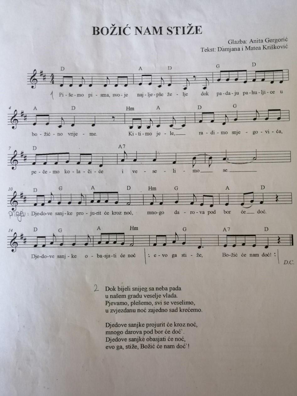 Prijedlog nastavnog sata glazbene kulture za 5. razred OŠ obrada pjesme Božić nam stiže uz pokrete.
