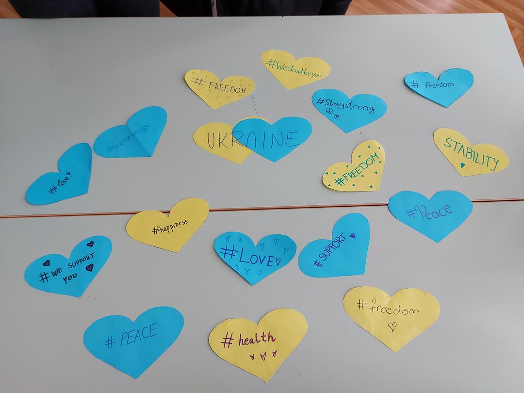 Students brainstorm words that represent best wishes for Ukraine and write them on blue and yellow hearts.