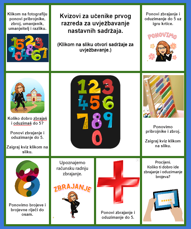 Nastavni materijal obuhvaća 8 - obrazovnih igara - kvizova kroz koje učenici ponavljaju pojmove pribrojnici zbroj zbrajanje umanjenik umanjitelj razlika i oduzimanje.