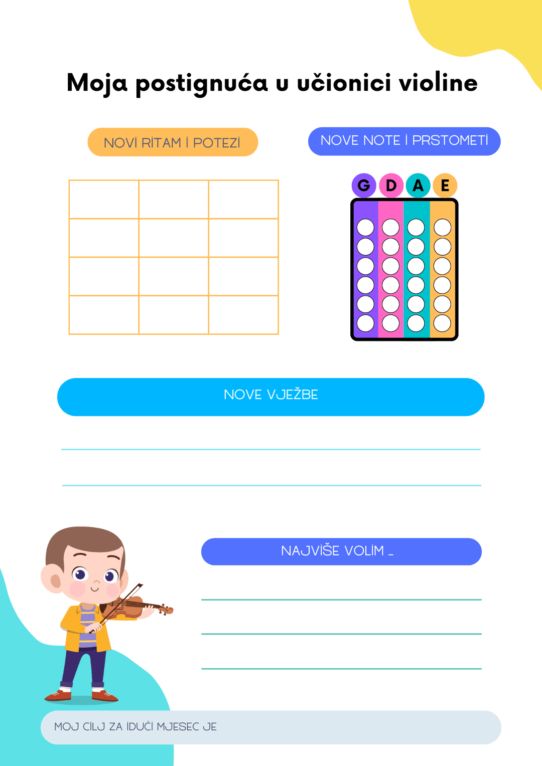 Refleksija i analiza naučenog puno puta nam mogu pomoći u napretku kao i postavljanje novih ciljeva. Mali dnevnik "Moja postignuća u učionici violine" možete koristiti svaki mjesec ili nakon nekoliko mjeseci rada. Kod učenika razvijate kompetencije analize i refleksije vlastitog rada i kritičko mišljenje.