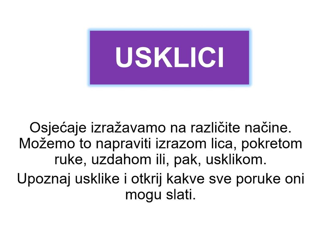 Materijal sadrži PowerPoint prezentaciju za obradu ili ponavljanje nastavne jedinice - Usklici te digitalne igre za ponavljanje i vježbanje. Na početnim slajdovima prezentacije objašnjeno je na primjerima da usklike koristimo za dozivanje, oponašanje zvukova te izražavanje osjećaja. Na sljedećen slajdu istaknuti su najčešći usklici. Na primjerima ističemo da su veznici nepromjenjiva vrsta riječi te da njihovo značenja razumijemo iz konteksta rečenice. Na primjerima ističemo da usklike u rečenici odvajamo zarezom te da usklik može biti samostalna rečenica.. Digitalne igre - kviz usklici, digitalna igra - odaberi točno napisane rečenice i digitalna igra u kojoj učenici prepoznaju usklik i određuju im značenje.