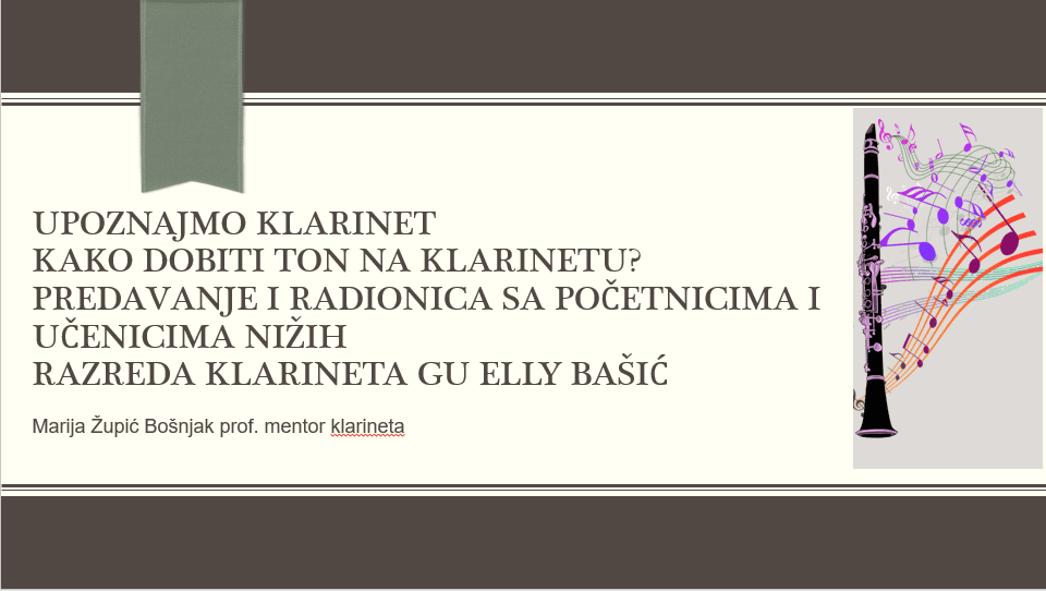 "Upoznajmo klarinet, i kako dobiti ton na klarinetu ?!" prezentacija je namjenjena svima koji se žele upoznati sa ovim predivnim drvenim puhačkim instrumentom. Zanimljivosti iz prošlosti, kako je nastao današnji klarinet, do toga kako dobiti ton na klarinetu, pravilna postava, disanje, ambažura, te počeci nastave s učenicima klarineta.